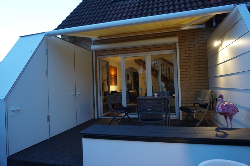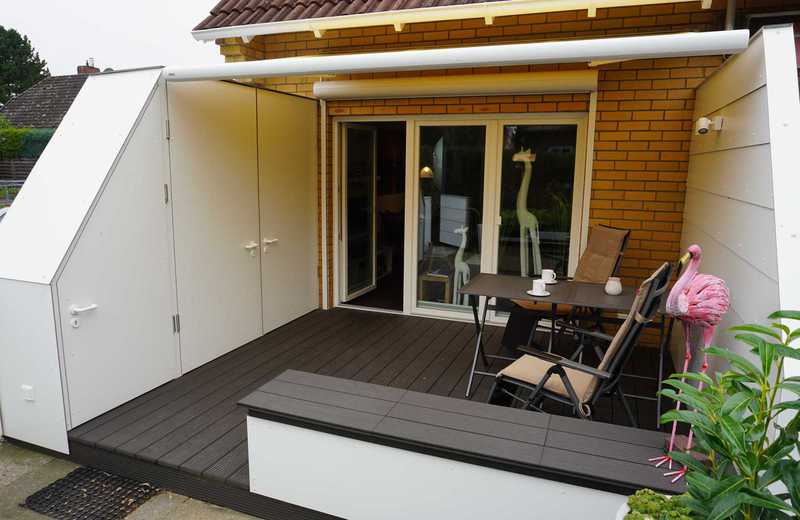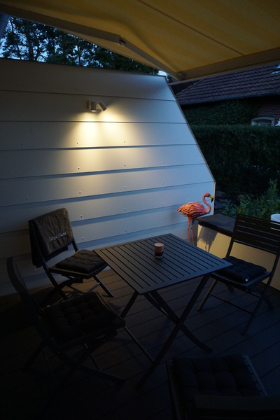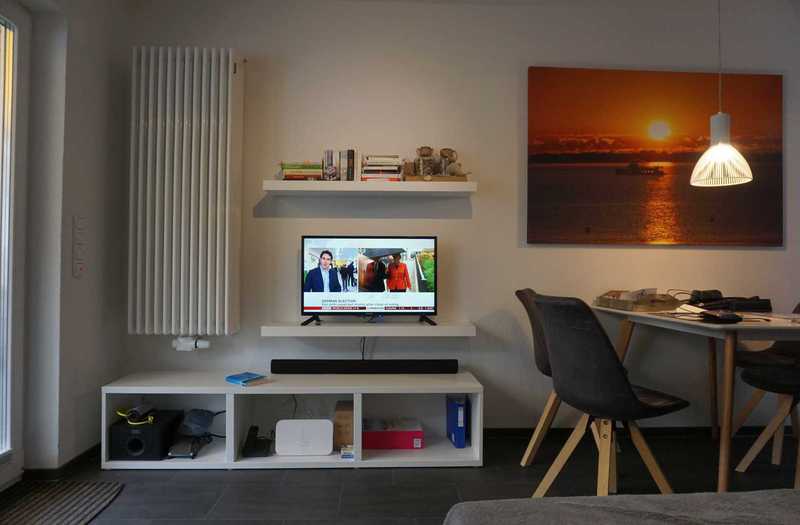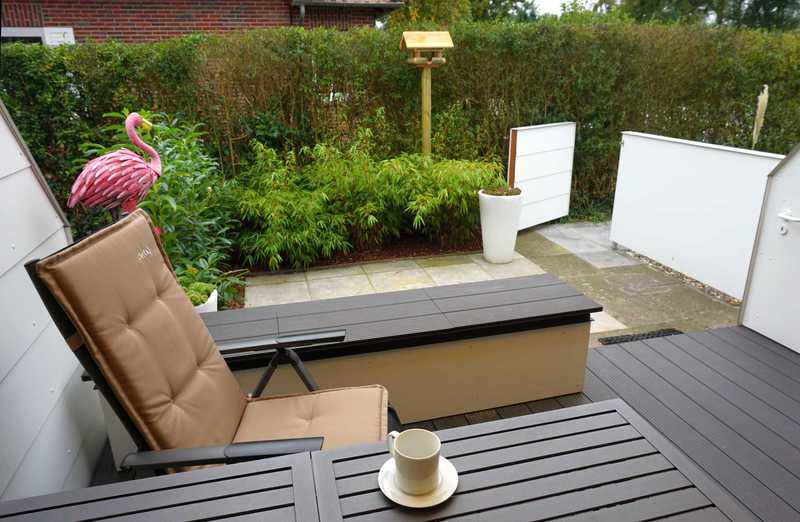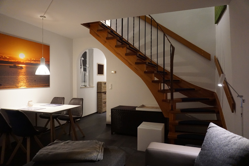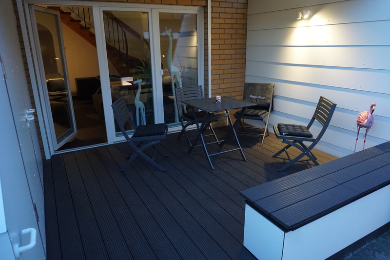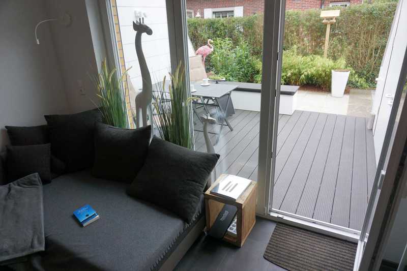 Im Erdgeschoss befindet sich das Wohnzimmer mit gemütlicher Sofaecke zum Entspannen, eine Süd-Terasse samt Sonnenschutz und Liegestühlen.