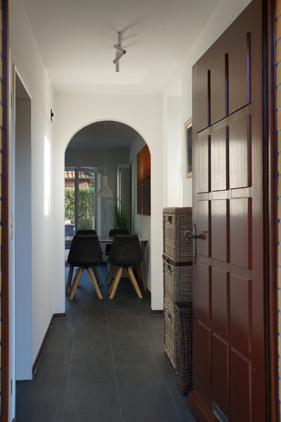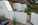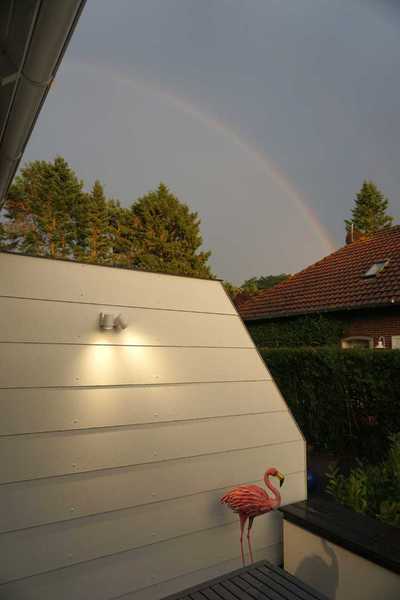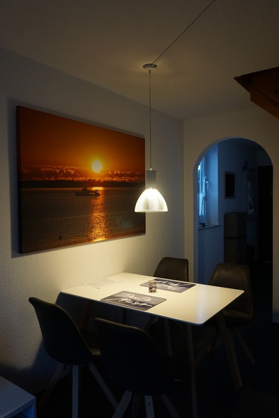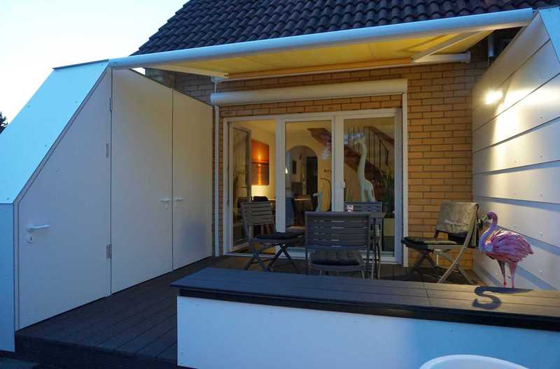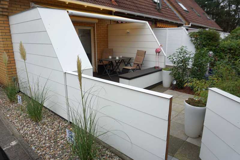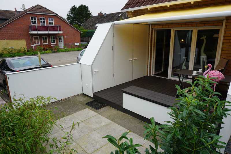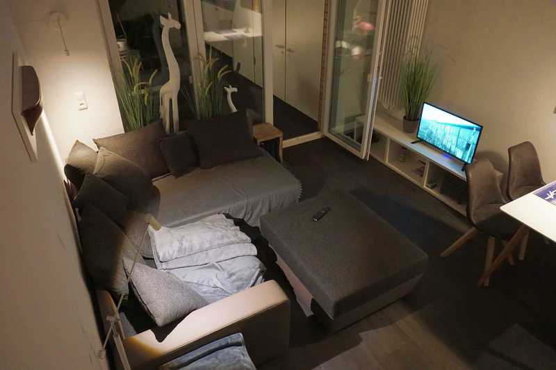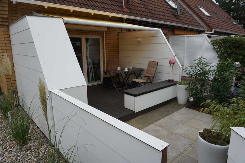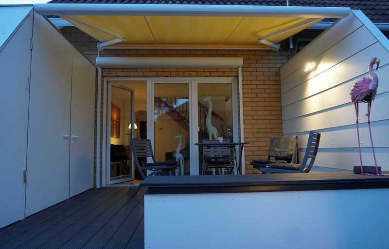 Im Erdgeschoss befindet sich das Wohnzimmer mit gemütlicher Sofaecke zum Entspannen, eine Süd-Terasse samt Sonnenschutz und Liegestühlen.